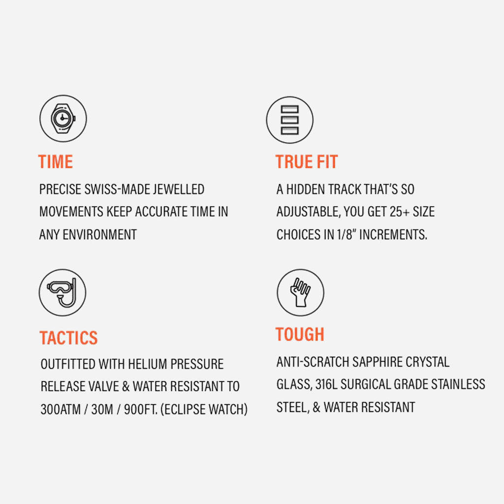 Perfect Fit Strap:? Micro adjustable watch strap let¡¯s you choose from 20+ size positions in 1/8 increments for perfect wrist fit. Accommodates any wrist size from 147 mm (5.75) up to 206 mm (8.13) in circumference. Patented.?
