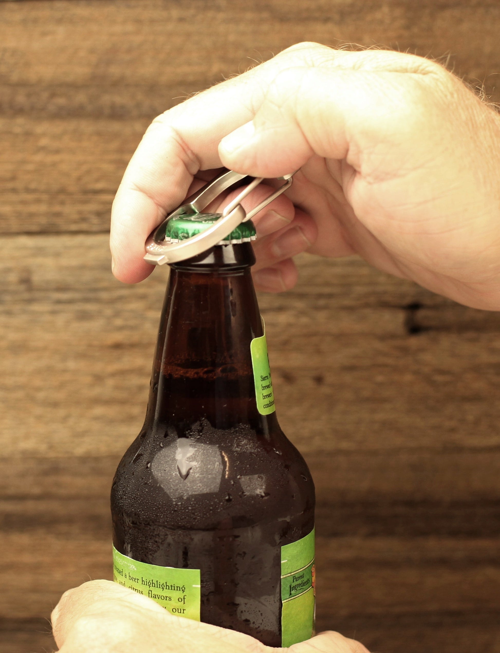 - Constructed of?high-grade, zinc alloy (contains nickel) this versatile, compact keychain features several handy tools that most guys need. Including a Bottle opener to easily pop off beer and soda tops, a GoPro wrench tool to tighten and loosen accessory knob, and a flat-head screwdriver for DSLR camera and camera tripods. It clips to your belt loop or a backpack loop. This is not a carabiner and it is not designed for climbing, or rated to support weight. ?