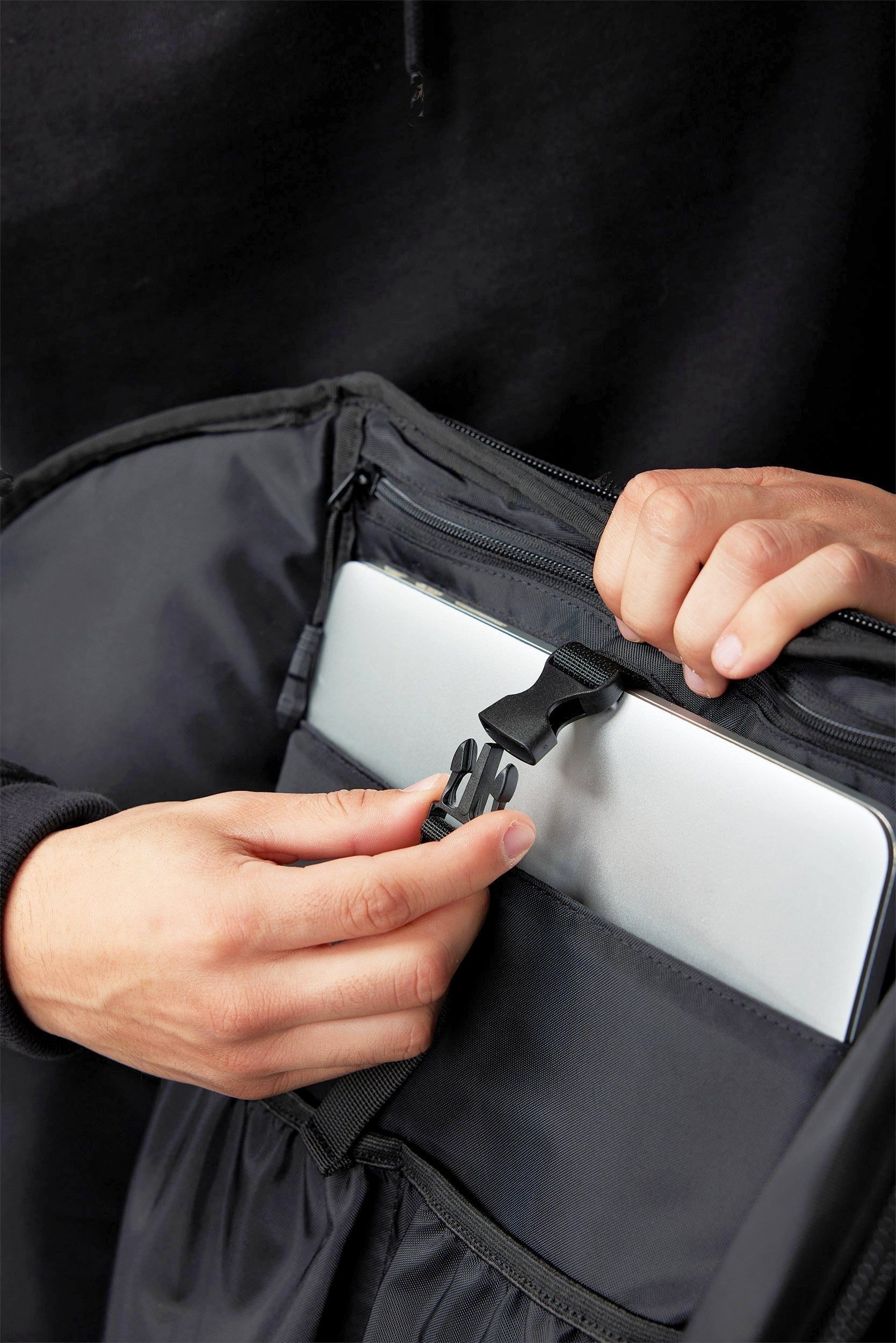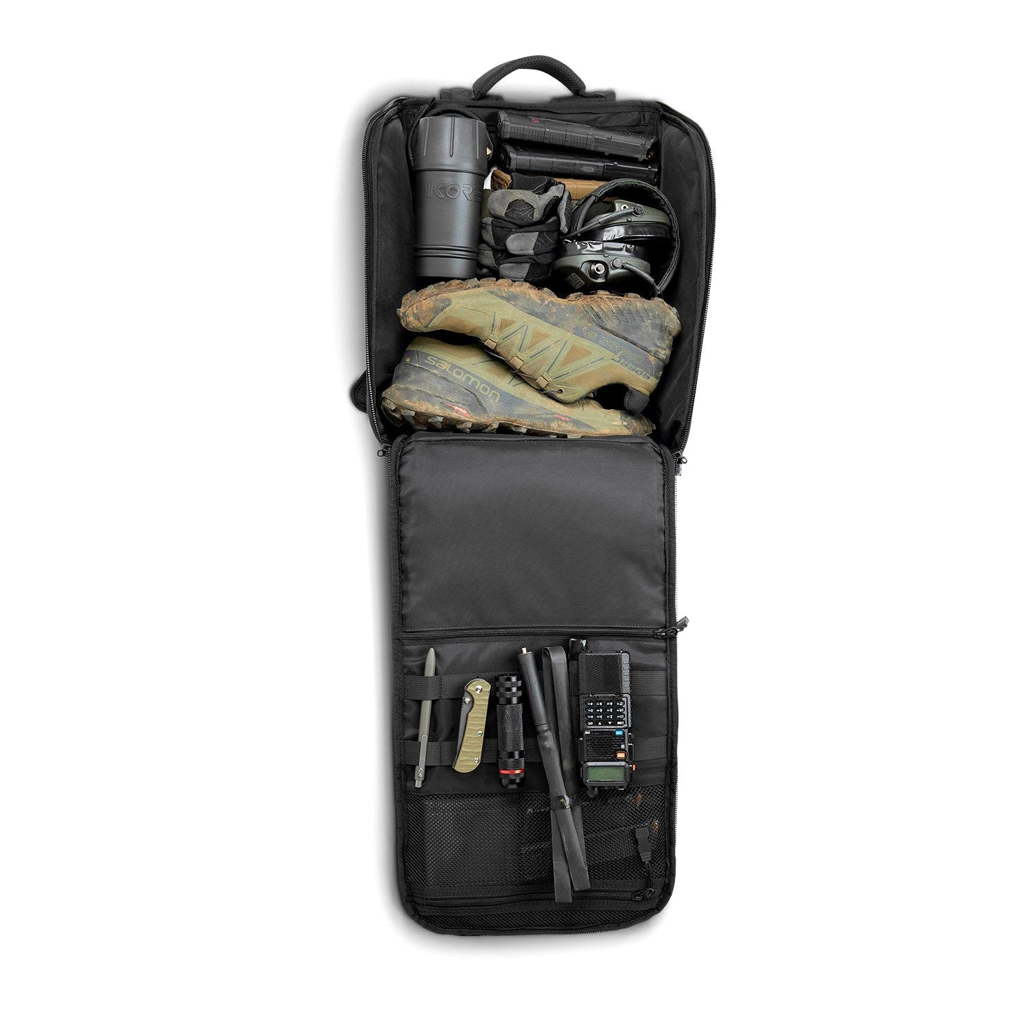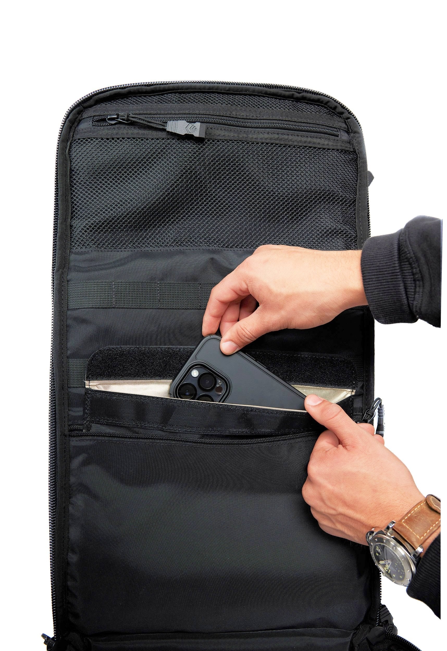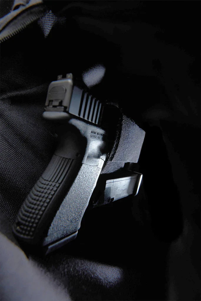 2. Firearm Compartment?holds a compact to full-size firearm + 1 extra magazine using our patented neo-magnetic suspension?system. Accessible from either side of the pack (left or right handed) for a quick smooth draw. One Size Fits All.?(included)